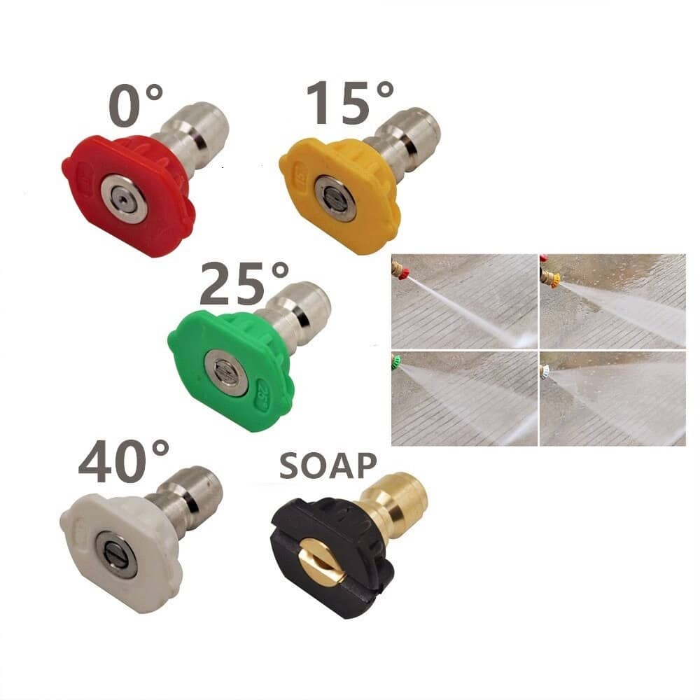 Produsul set 5 duze pulverizare de inalta presiune cupla rapida 1/4″ este format dintr-un numar de 5 diuze ce se mufeaza la conectorul cupla rapida standard 1/4″ (mama) in sistem plug & play, acestea avand diferite unghiuri de pulverizare, mai exact 0°, 15°, 25°, 40° si 60° (ultima fiind folosita in special pentru spumare).