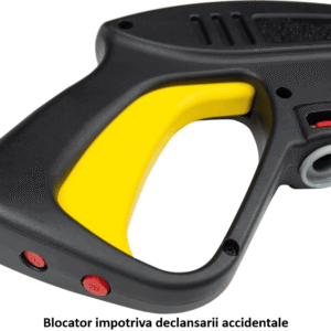 Pistolul este prevazut cu blocator impotriva declansarii accidentale, precum si cu o parghie de eliberare rapida a furtunului ce vine de la aparatul de spalat cu presiune.